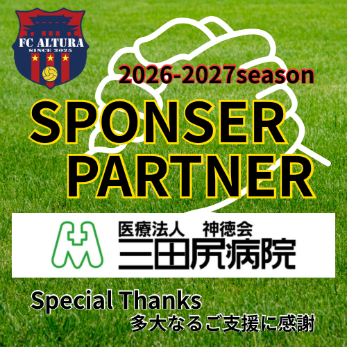 立ち上げ当初より、FCアルトゥーラ防府の活動を支えてくださっている「医療法人神徳会三田尻病院」様。選手たちが日々成長し、ピッチで躍動できるのは温かいご支援のおかげです。感謝の気持ちを忘れず、チーム一丸となって邁進します。